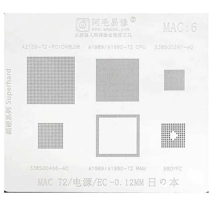 MAC6 — T2 support models A2159 T2-P01CK8L08, A1989/A1990 T2 CPU, 338S00269-A0, 338S00466-A0, A1989/A1990 T2 RAM, 980YFC; 0.12 mm.MAC6-Stencil Best ones are stainless steel, laser-cut, anti-warp and all supported ic or chip mummer is clear engraved in MAC-6