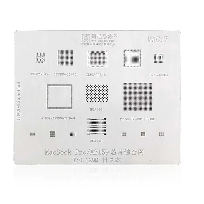 MAC7 — MacBook Pro A2159 and Meany other CD3217B12 (USB-C/PD), 338S00466-A0, 339S00616, CD3215B03, BGA110, A2159-T2-P01CK8L08, BGA178; 0.12 mm.MAC7-Stencil Best ones are stainless steel, laser-cut, anti-warp and all supported ic or chip number is clear engraved in MAC-7